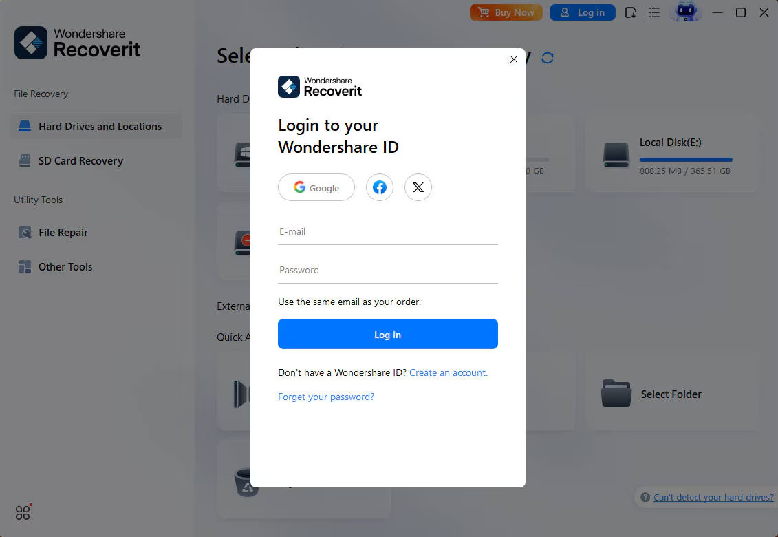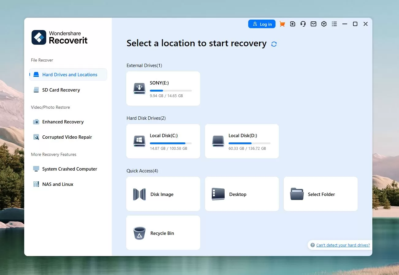 На Windows-версии Recoverit при запуске по умолчанию в левой панели отображается раздел Hard Drives and Locations. Именно оттуда начинается стандартный сценарий восстановления. Внутри этого раздела Recoverit показывает вкладки:
