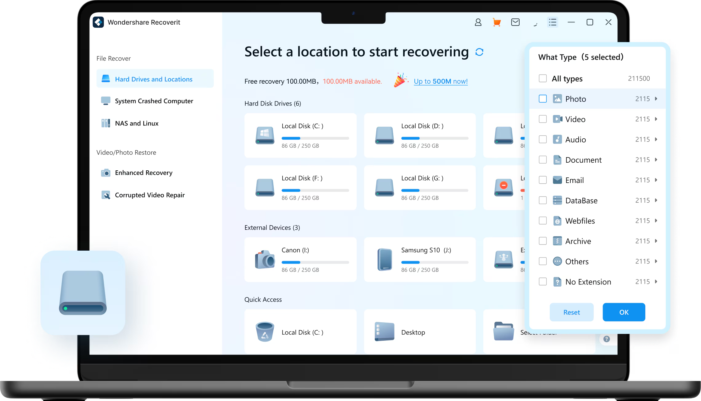 Практический смысл: на Windows Recoverit уверенно покрывает NTFS/FAT/exFAT и дополнительно перечисляет ReFS; на macOS добавляется APFS/HFS-линейка, а также в интерфейсе встречаются сценарии вроде восстановления из iCloud и работы с NAS/Linux-подключениями (о них ниже).