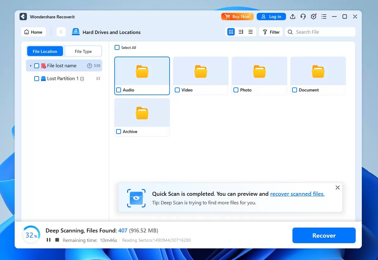 Recoverit показывает прогресс сканирования и параллельно даёт инструменты «найти нужное прямо сейчас». В Windows-руководстве это описано как возможность «pinpoint files during the scanning» — то есть уточнять результаты прямо во время поиска, не дожидаясь конца.