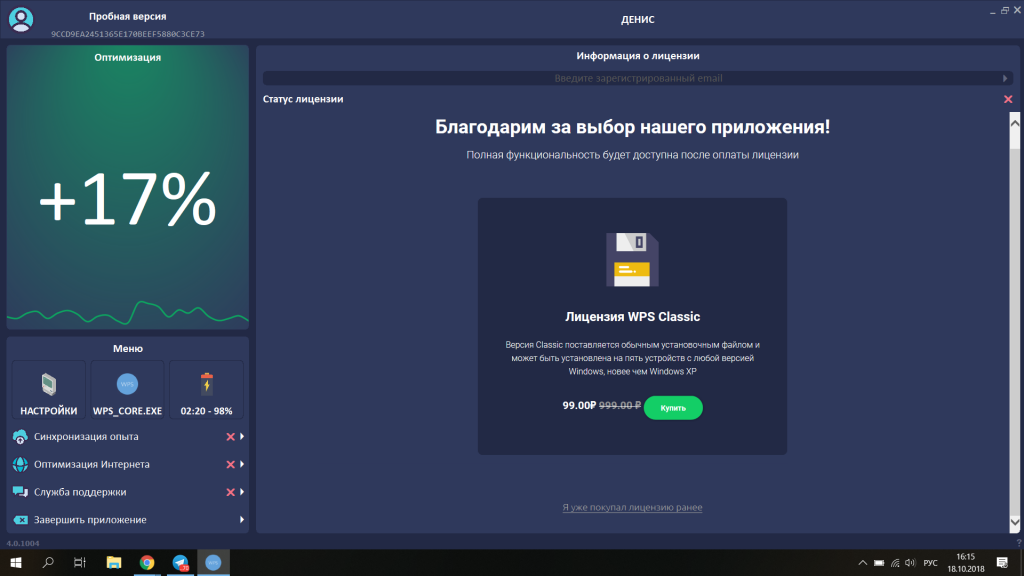 После установки WPS Performance Station работает как утилита фонового режима: