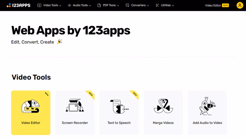 На главной 123apps вы видите шапку с раскрывающимися меню (Video Tools / Audio Tools / PDF Tools / Converters / Utilities) и ниже — карточки инструментов по разделу. Это удобно, если вы «помните задачу», но не помните название инструмента.