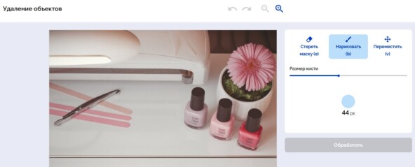 Понятные кнопки и инструменты: «Обработать», «Удалить объекты», «Нарисовать», «Стереть маску», «Переместить», «Размер кисти».