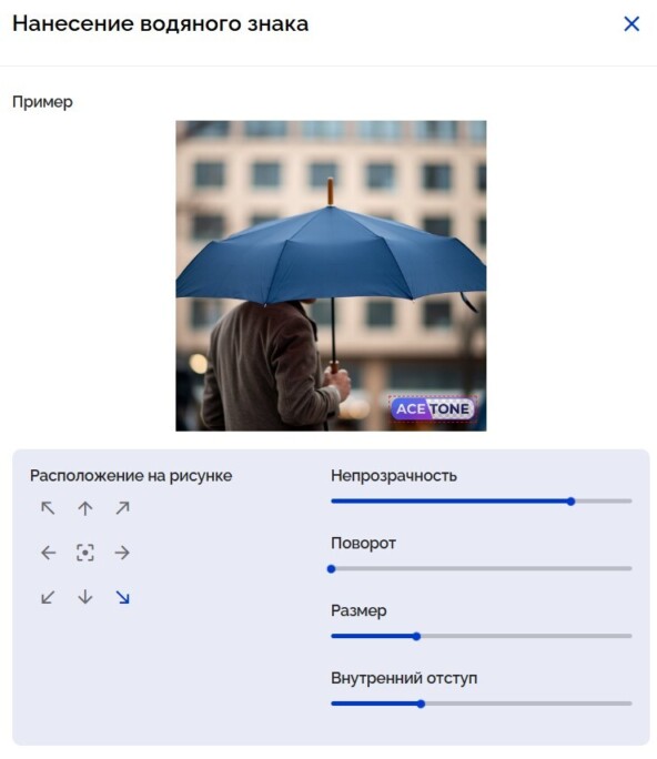 Водяной знак с удобными параметрами: «Расположение на рисунке», «Непрозрачность», «Поворот», «Размер», «Внутренний отступ».