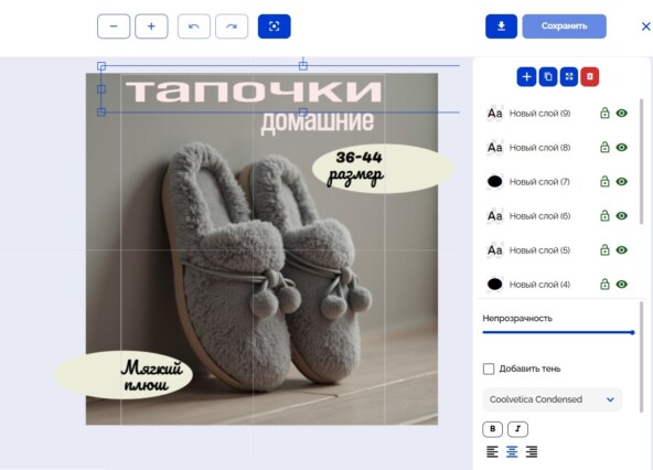 «Дизайны (beta)» — редактор, где из подготовленных фото собирается карточка товара для Wildberries / Ozon / Avito с текстом, плашками и фигурами.