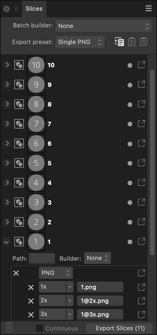 Export Persona — режим подготовки экспорта: Slices, размеры 1x/2x/3x, пакетный вывод ассетов.