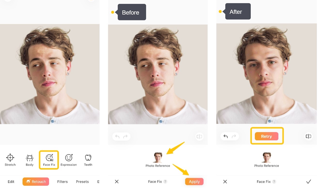 Face Fix — один из самых «прикладных» инструментов AirBrush: вы берёте неудачное выражение лица (мигнули, улыбка «не та», взгляд ушёл), подгружаете удачный референс и получаете более приятный вариант.