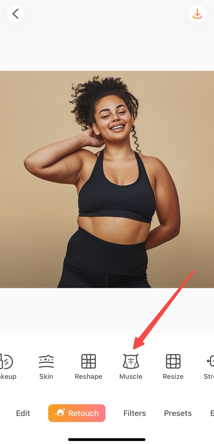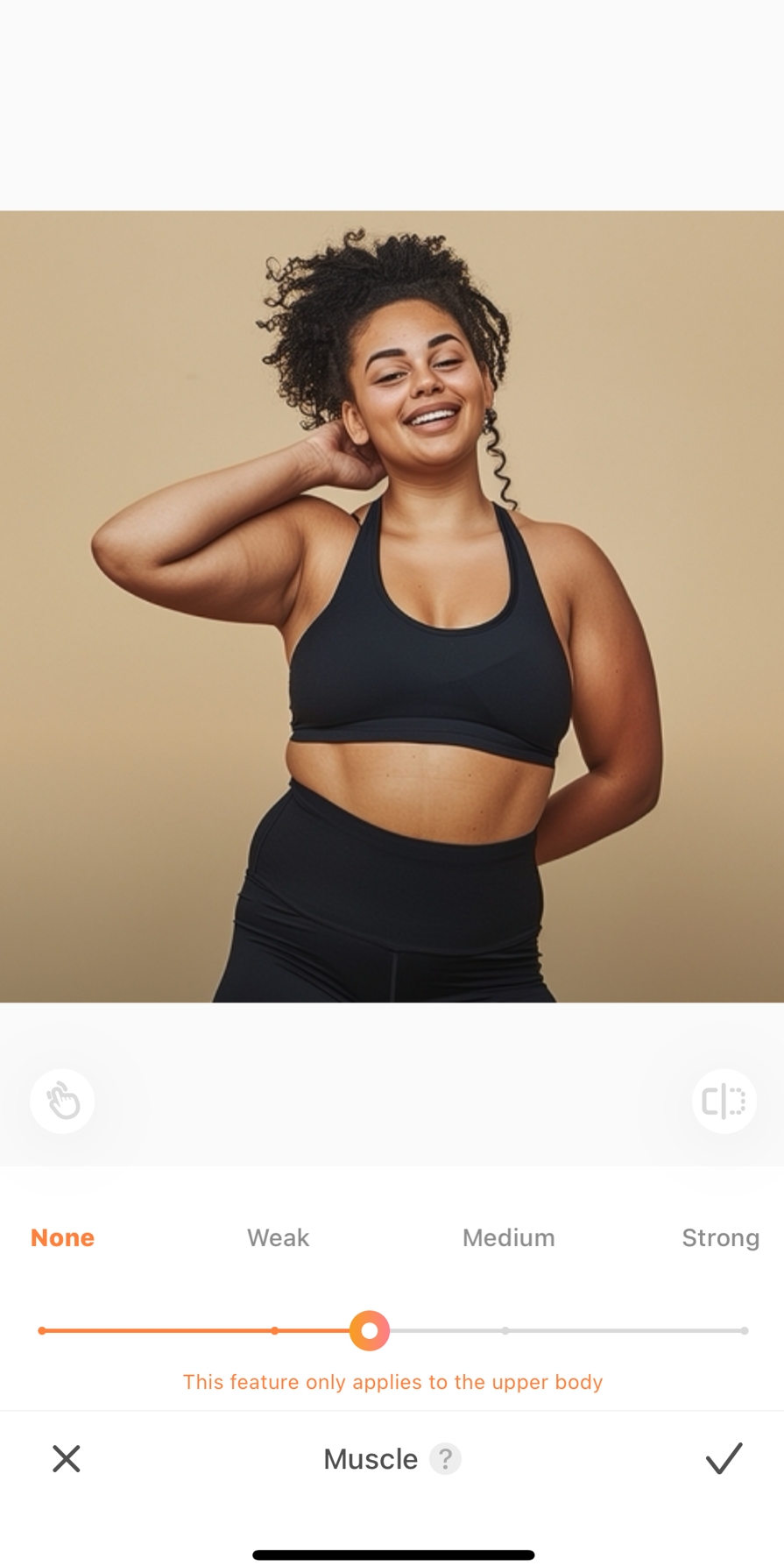 Инструмент Muscle в AirBrush делает понятную вещь: добавляет визуальную «выраженность» верхней части тела (грудь/пресс) и даёт контролировать силу эффекта.