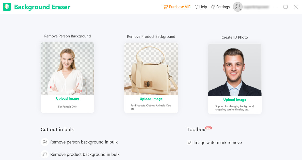 На старте desktop-версия показывает несколько крупных плиток Upload Image, и это важный момент: программа предлагает заранее выбрать тип распознавания (портрет / продукт / печать-логотип-подпись). Это не «маркетинговый» экран, а реально полезная настройка — качество вырезки зависит от правильно выбранного режима.