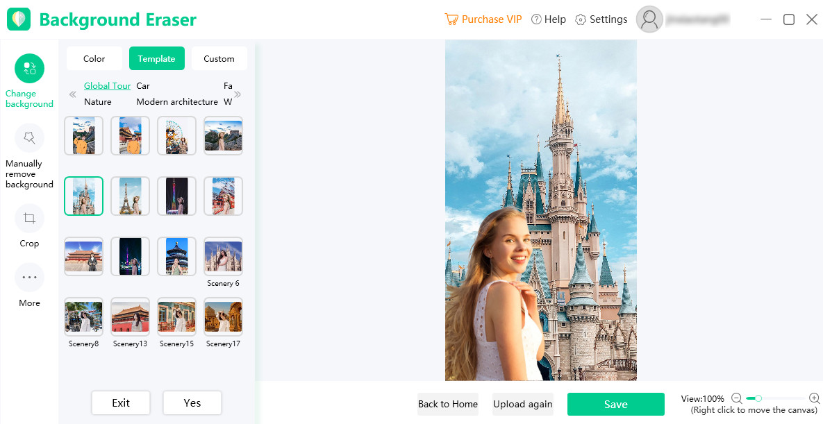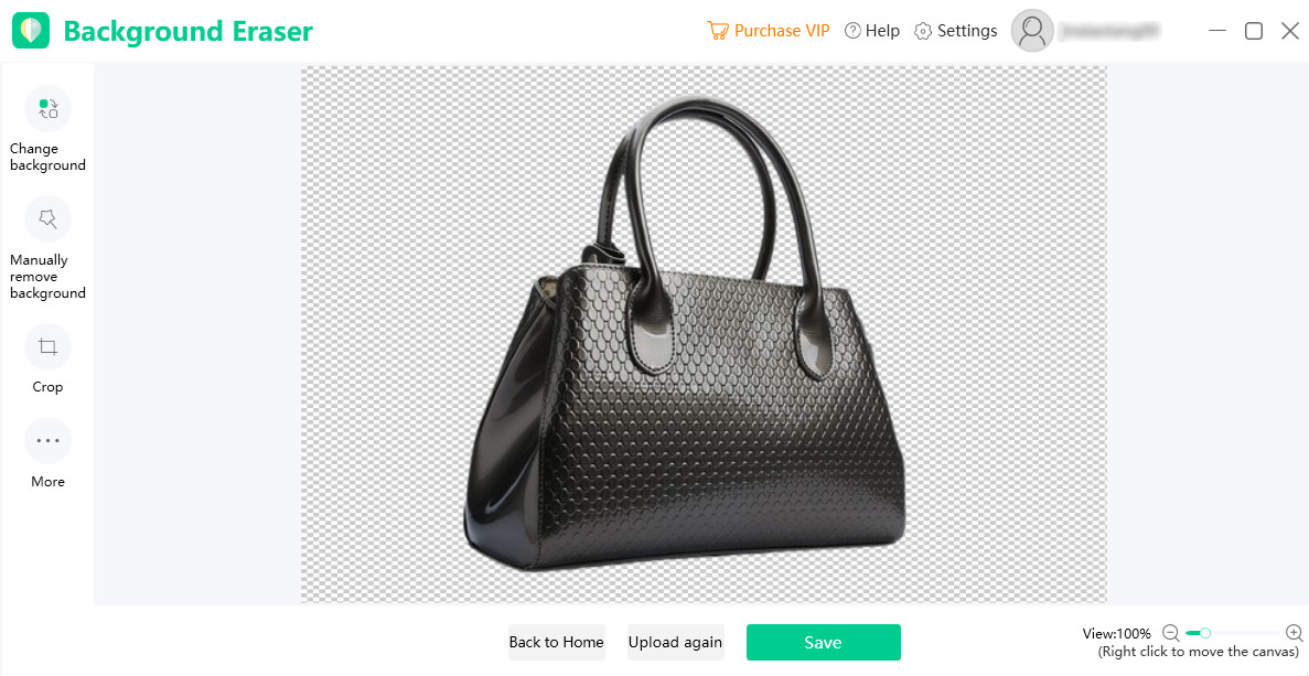 В верхней части окна видны сервисные элементы: Purchase VIP, Help, Settings и значок профиля (аккаунт). Они не мешают работе и всегда доступны.