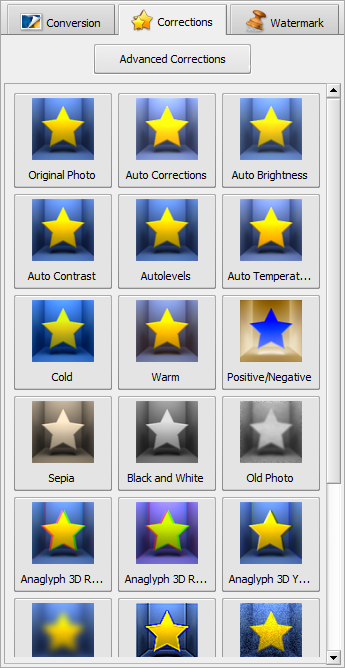 Conversion,Corrections,Watermark— это центральная рабочая зона.