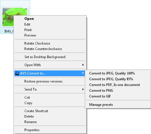 Одна из самых удобных особенностей AVS Image Converter — Quick Conversion: вы создаёте пресеты внутри программы, а затем применяете их к файлам из контекстного меню Windows.