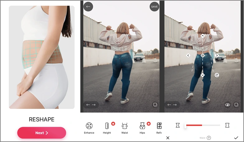 Инструмент талии — один из самых востребованных: он позволяет сделать силуэт более выраженным буквально за несколько секунд. В демонстрационных материалах это подаётся как “Perfect Waist”: вы двигаете слайдер и сразу видите изменение объёма