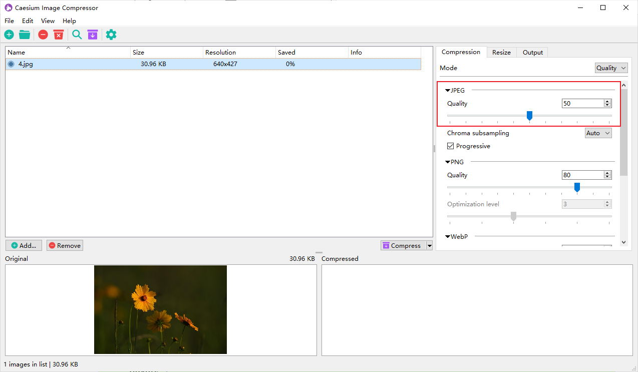Во многих версиях Caesium основные параметры продублированы снизу в блоке Compression Options: