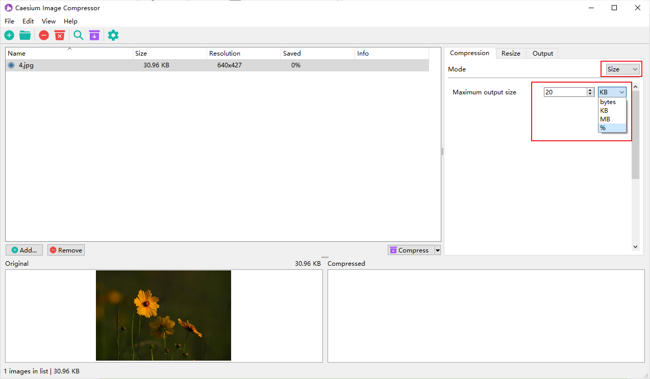 В режиме Size вы задаёте Maximum output size и единицы измерения (KB/MB и т. п.). Это удобно для «подгонки под лимит».