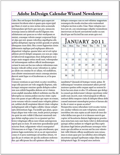Еще одна сильная задача — работа внутри уже готового макета. Tutorial со вставкой в newsletter показывает очень показательный сценарий: есть подготовленный дизайн, в нем существует текстовый фрейм, и именно в него Calendar Wizard встраивает календарный блок. Это резко упрощает работу над рекламными материалами, корпоративными разворотами и страницами, где календарь — не центральный объект, а часть композиции.