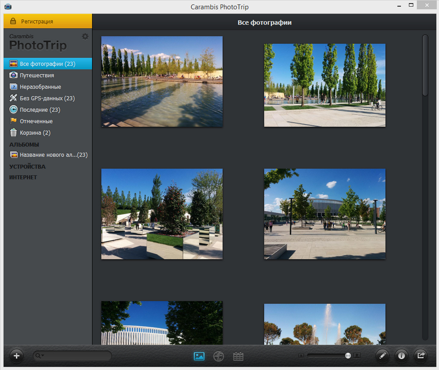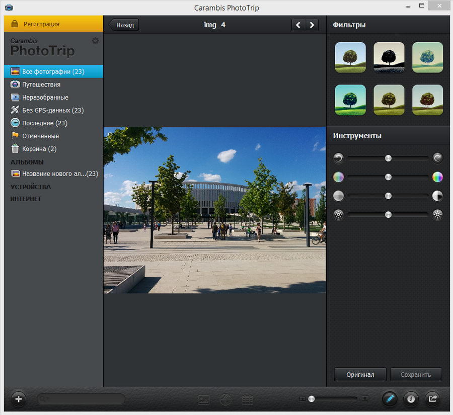 Carambis PhotoTrip — удобный выбор, когда вам нужен понятный каталогизатор фотографий на ПК с сильным акцентом на путешествия: карта, календарь, разделение на «Неразобранные» и «Без GPS-данных», быстрый отбор «Отмеченные», безопасное удаление через «Корзина» и встроенная обработка для приведения снимков к приятному виду.