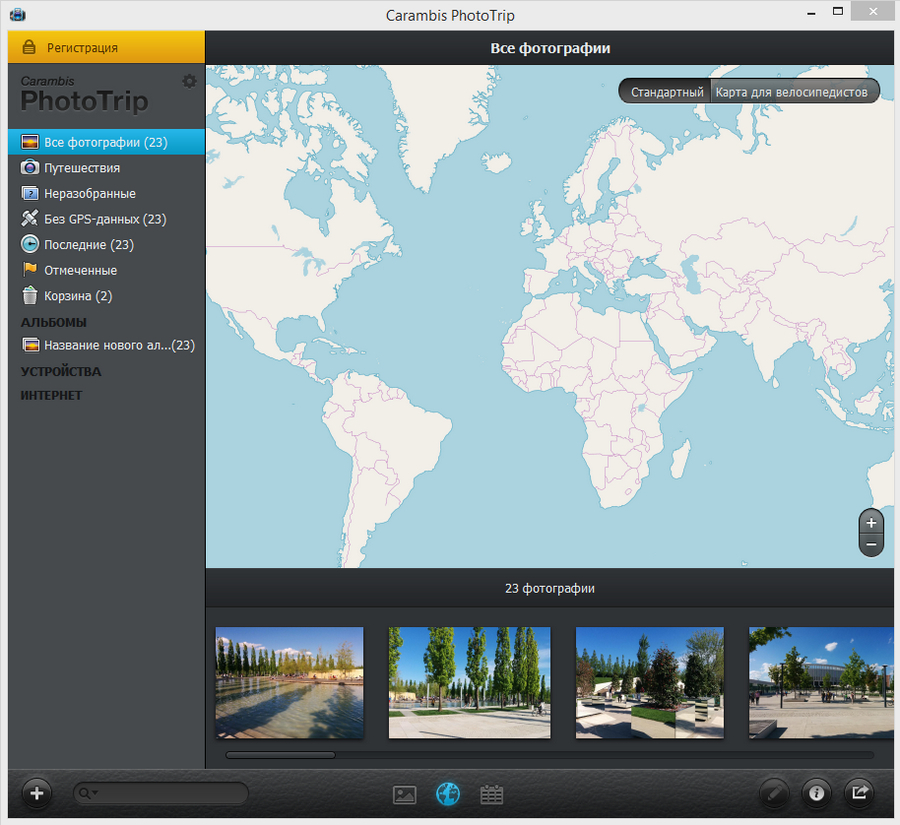 В верхней части рабочей области PhotoTrip показывает, где вы находитесь: например, заголовок «Все фотографии» в центре. Внутри карты появляются переключатели типа «Стандартный» и «Карта для велосипедистов» — это выбор слоя/стиля карты.