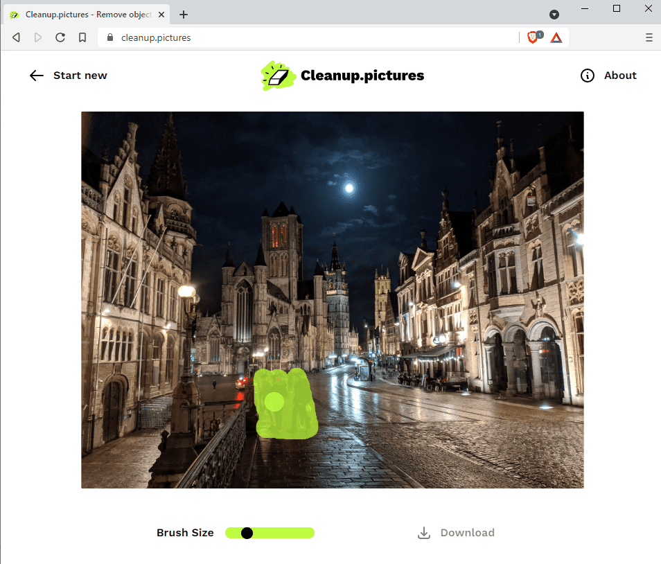 Cleanup.pictures обычно применяет удаление сразу после того, как вы заканчиваете штрих/отпускаете кнопку мыши или палец: выделенная область заменяется восстановленным фоном.