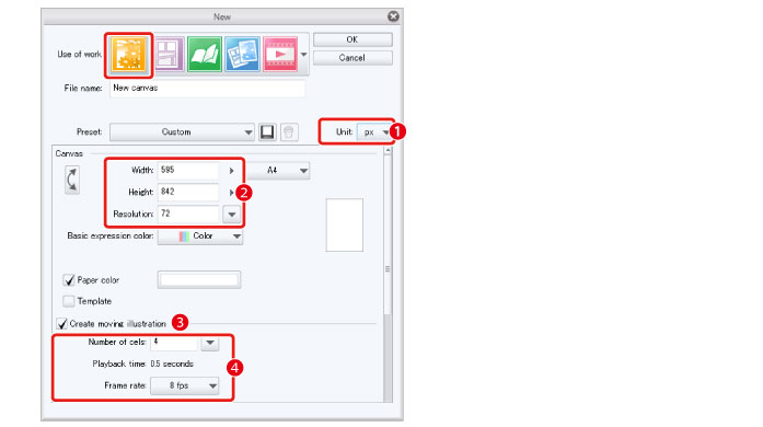 Опции движения: Create moving illustration, Number of cels, Frame rate — если вы создаете анимационный файл/«живую иллюстрацию».