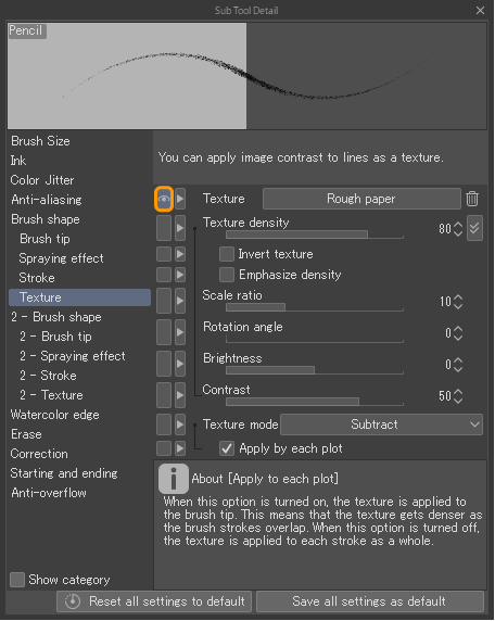 Save all settings as default — фиксирует текущее состояние кисти как новое «по умолчанию».