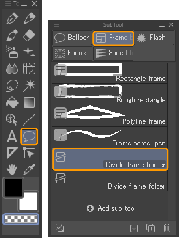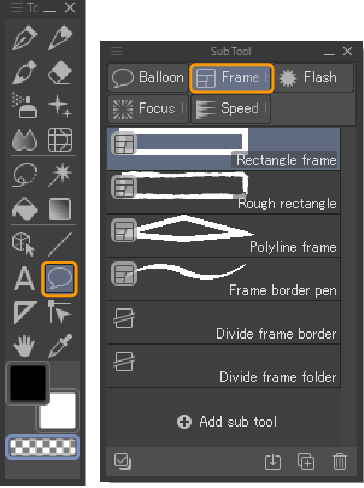 Sub Tool palette — набор пресетов выбранного инструмента. Например, у Pen это могут быть G-pen/Mapping pen и т. п.; у Comic — группы Balloon/Frame/Flash.