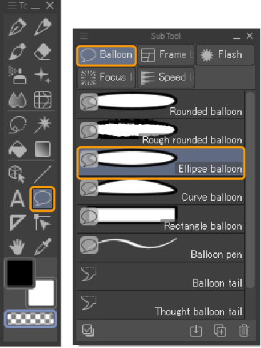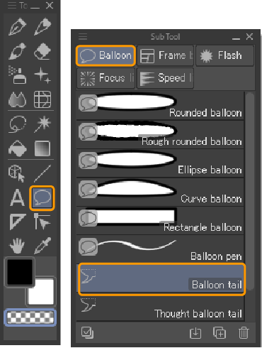 Comic tool → Balloon → Ellipse balloon, затем Balloon tail.