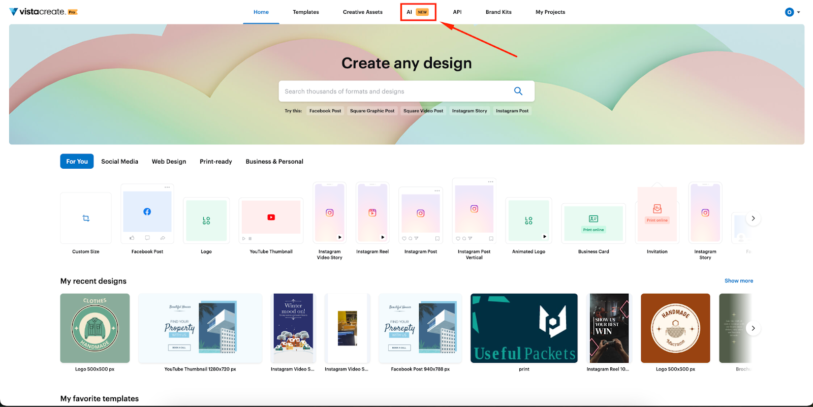 После входа VistaCreate ведёт на домашний экран, где собраны быстрые форматы (посты, сторис, обложки, логотипы и т. п.), строка поиска форматов и блок последних проектов. В повседневной работе это превращается в простую схему: