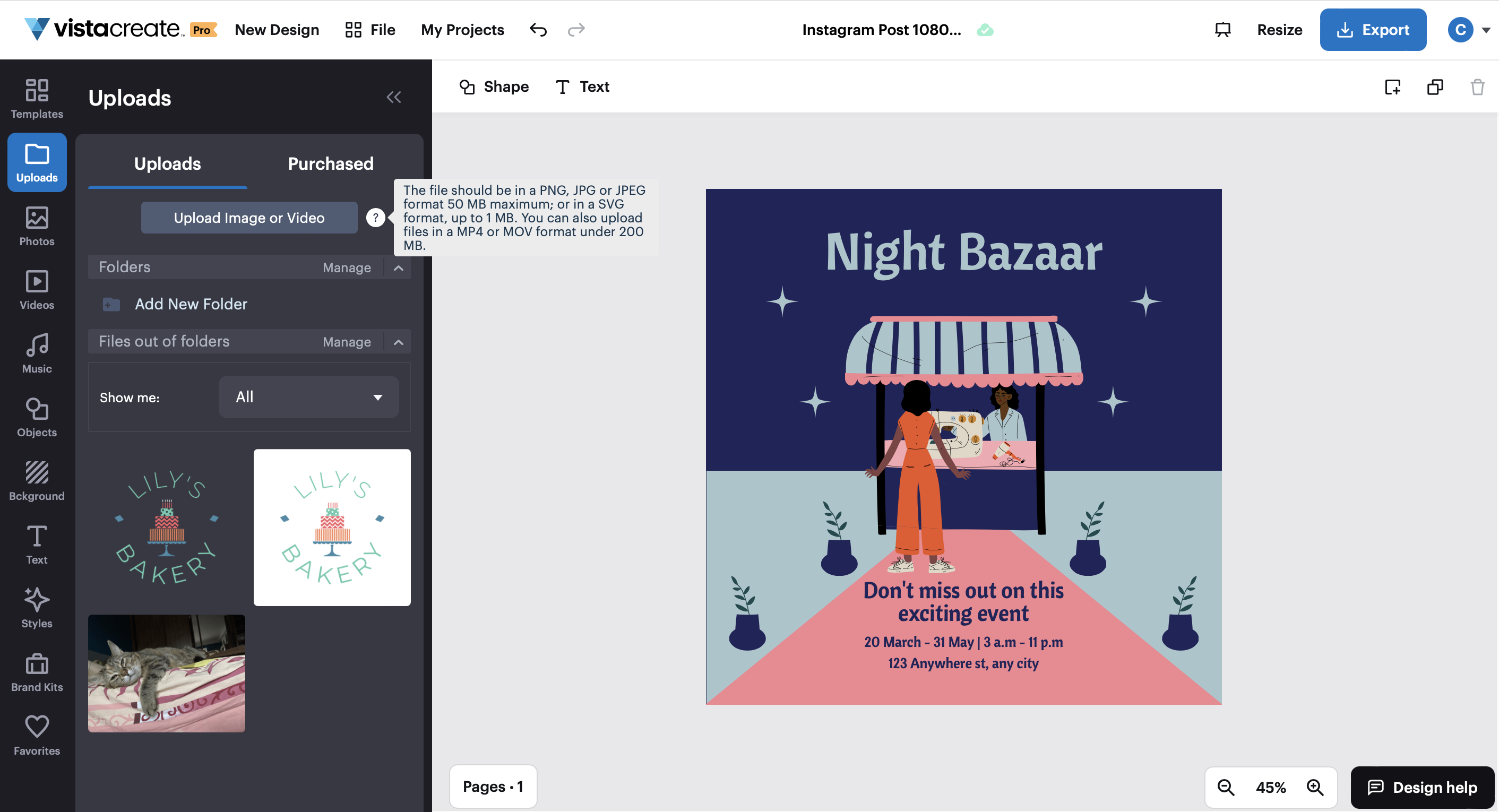 По ограничениям и форматам VistaCreate довольно практичен: изображения (PNG/JPG/JPEG) допускаются до 50 MB, SVG — до 1 MB; видео — MP4/MOV до 200 MB и длительностью меньше 60 секунд; аудио — WAV/MP3 до 50 MB; шрифты — OTF/TTF.