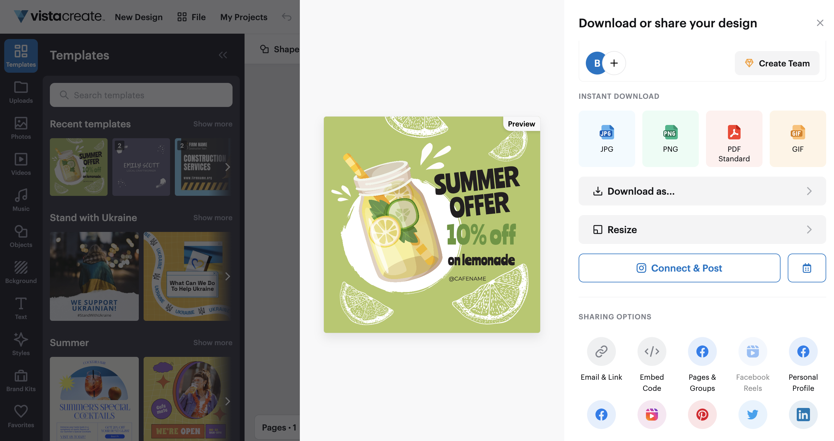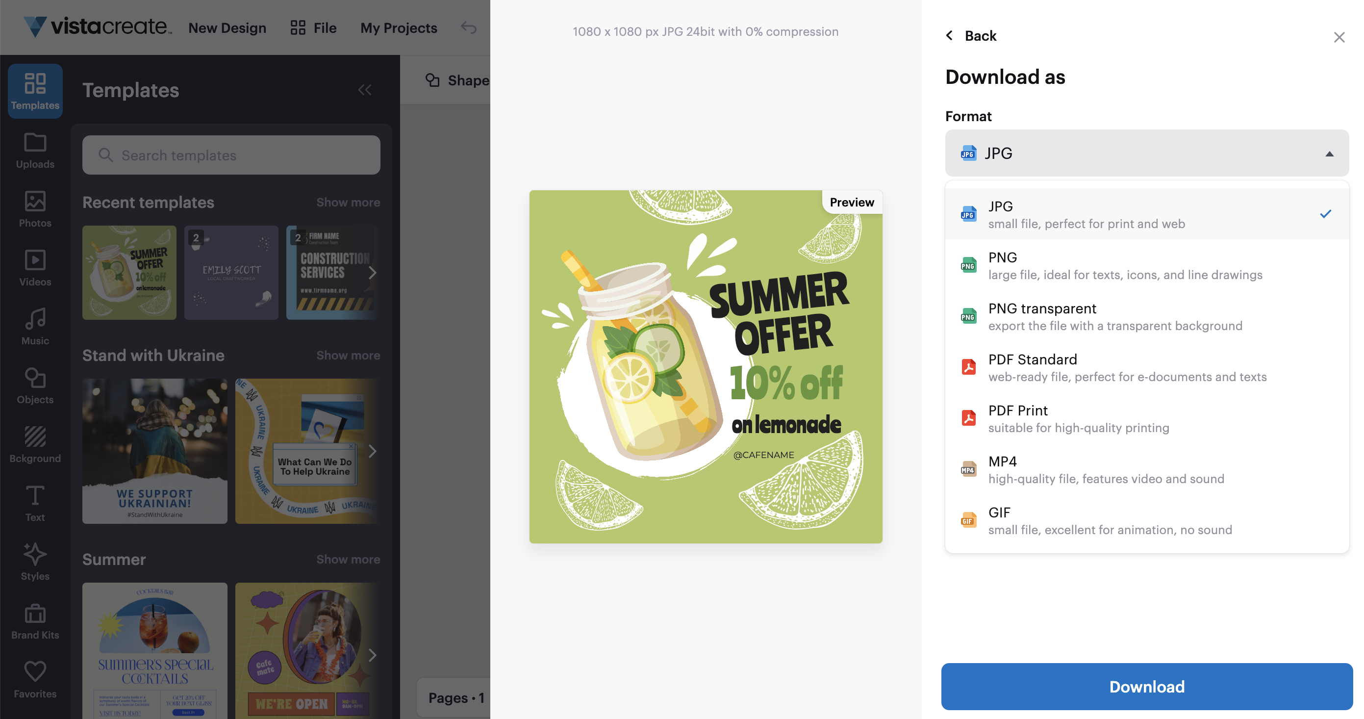 Экспорт: VistaCreate даёт понятный набор JPG/PNG/PNG transparent/PDF/MP4/GIF из одного окна Export. Canva также предлагает выгрузки в популярные форматы (PNG/JPG/PDF/MP4/GIF) с выбором типа файла в Download.
