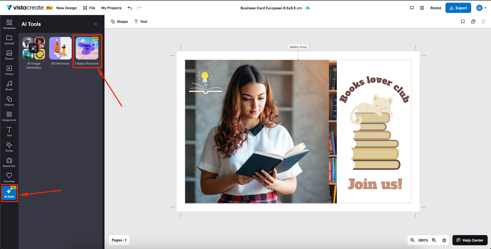 левая вертикальная панель — выбор инструментов (Templates, Uploads, Photos, Videos, Music, Objects, Background, Text, Styles, Brand Kits, AI Tools);