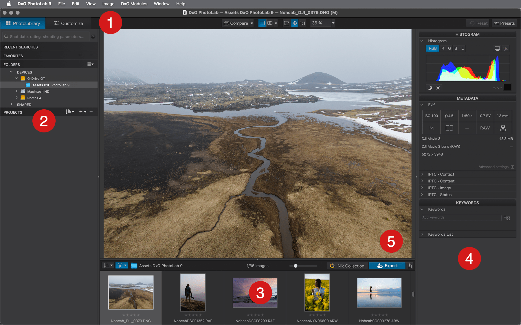 DxO PhotoLab работает «по месту»: вы открываете папку на диске и сразу видите изображения. Чтобы ускорить поиск и фильтрацию, PhotoLab умеет индексировать выбранные папки — это удобно, если у вас большой архив и вы хотите быстрые результаты по ключевым словам/рейтингу/камерам.