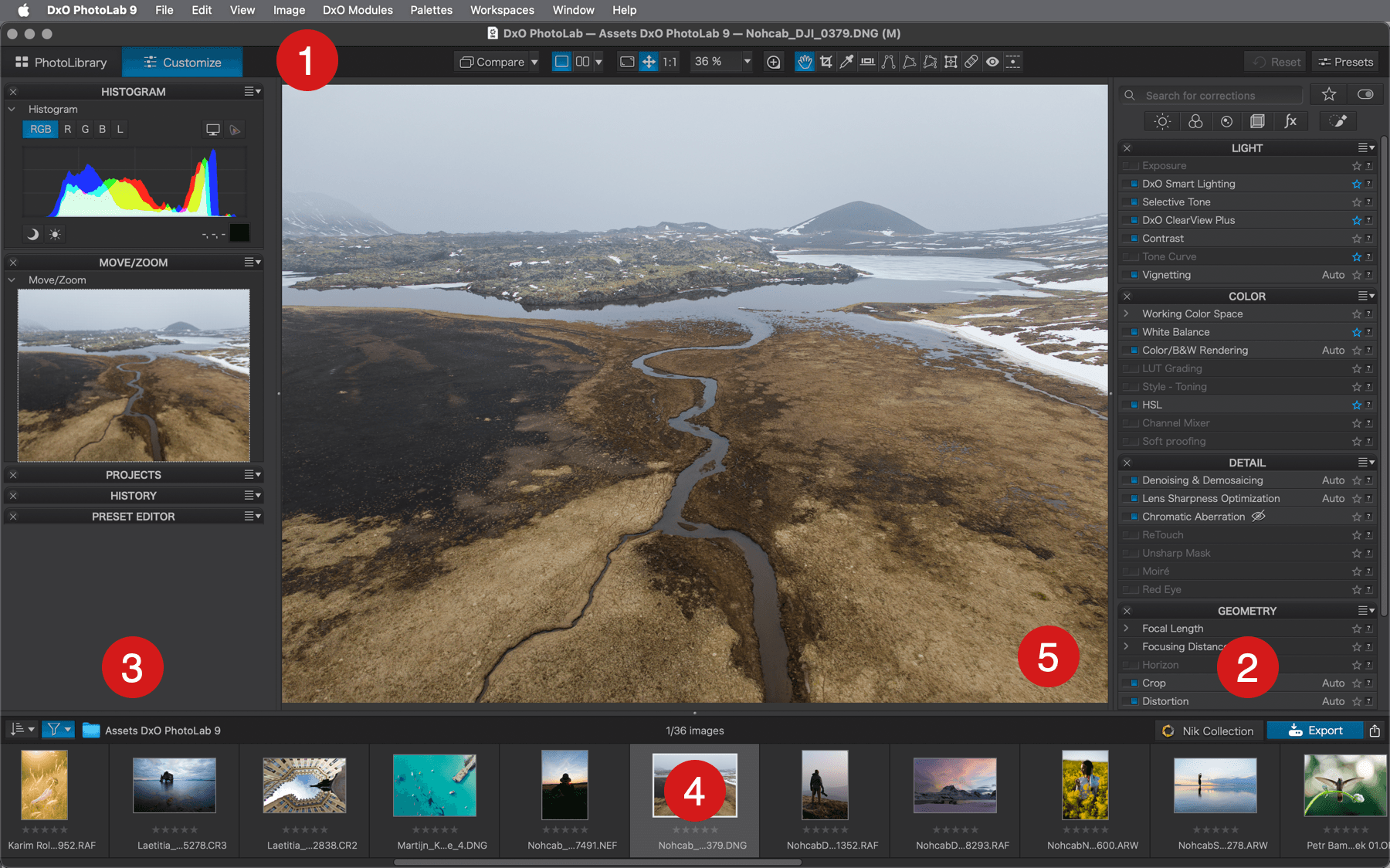 Интерфейс DxO PhotoLab: PhotoLibrary, Customize и Export