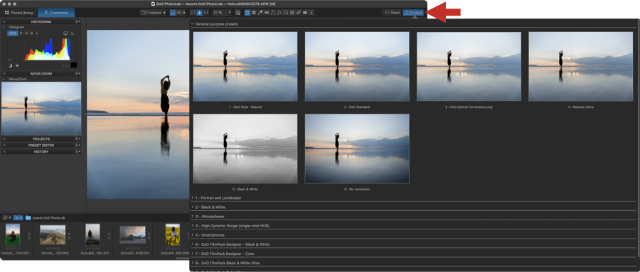 PhotoLab использует пресеты как полноценные «пакеты коррекций». В Customize есть Preset Editor, а в верхней части интерфейса — кнопка Presets (открывает окно визуального выбора).