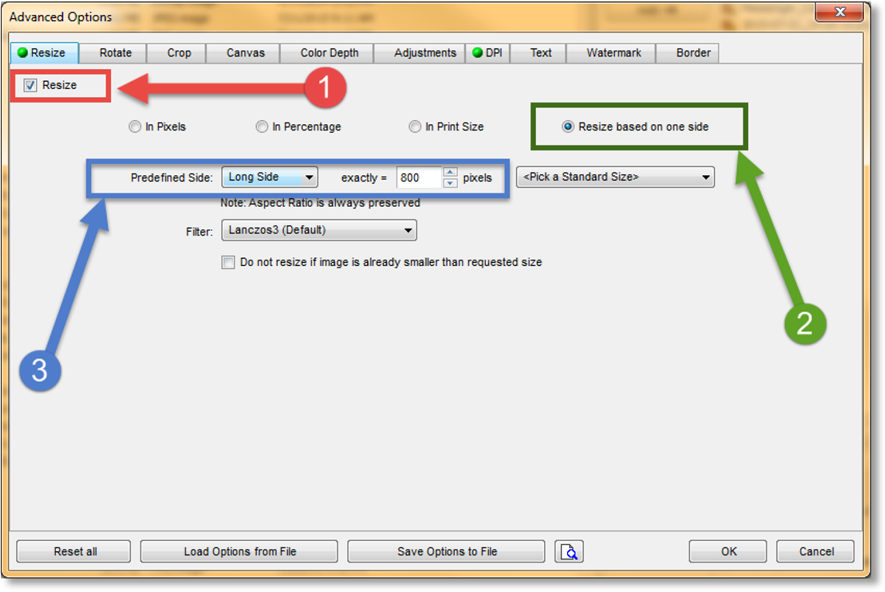 Сильная сторона FastStone Photo Resizer — окно Advanced Options. Оно включается так: