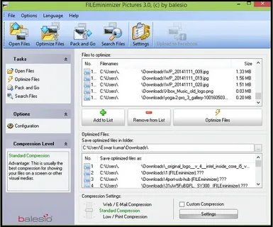 balesio FILEminimizer Pictures FREE (часто встречается как FILEminimizer Pictures 3.0) — это Windows-программа для оптимизации и сжатия изображений (JPEG/JPG, PNG, BMP, GIF, TIFF, EMF) с упором на практическую задачу: уменьшить размер фото/картинок в разы, чтобы их было проще хранить, отправлять по e-mail и публиковать в интернете.