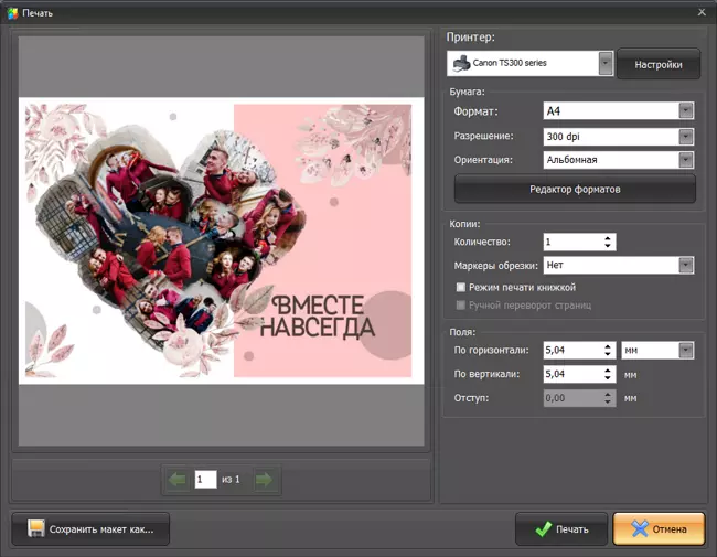 Если задача связана с печатью, ФотоКОЛЛАЖ ощущается особенно уверенно. Прямо из верхнего меню доступна команда Печать, а дальше можно выбрать принтер, формат бумаги, разрешение, ориентацию, количество копий и другие параметры. Такой сценарий удобен для домашнего вывода в рамку, подготовки открытки, плаката, романтического коллажа, семейной подборки или памятного постера. Программа не заставляет проходить длинную цепочку сторонних окон — печатная логика встроена в основной рабочий процесс.