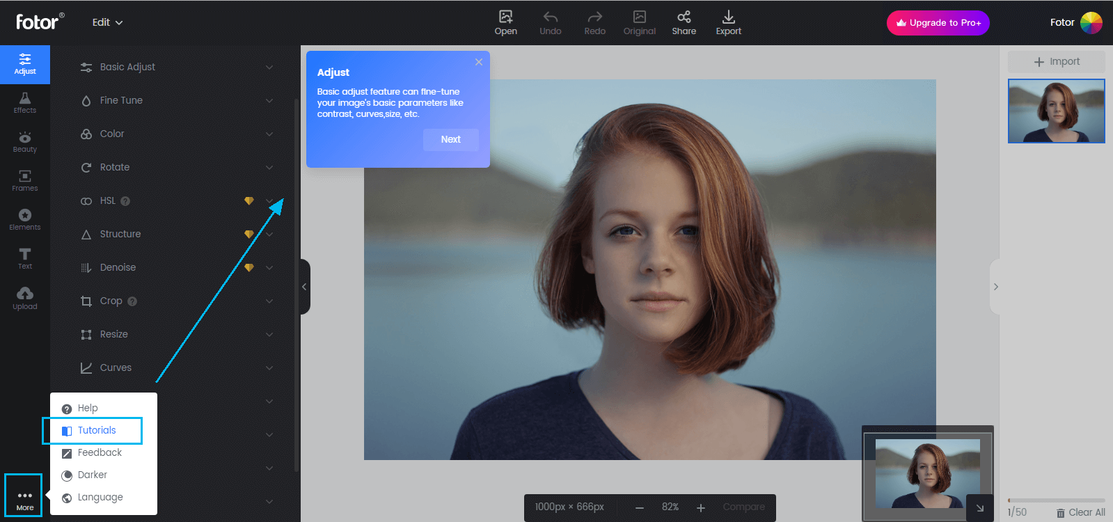 У Fotor характерная схема: инструменты слева, холст по центру, управление проектом сверху, а справа может быть панель с миниатюрой/очередью и быстрыми действиями.