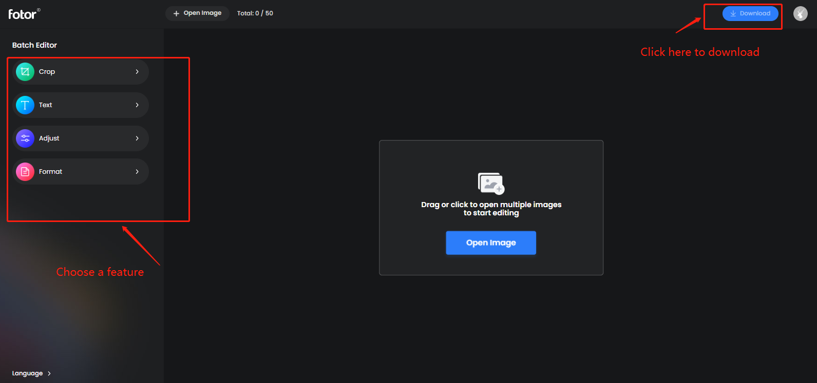 Откройте Batch (левая панель) → загрузите файлы → выберите режим Crop/Text/Adjust/Format → Download.
