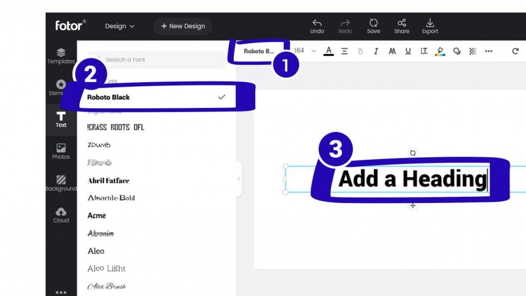 Добавьте или поправьте текст через Text (Add heading / Add subheading).