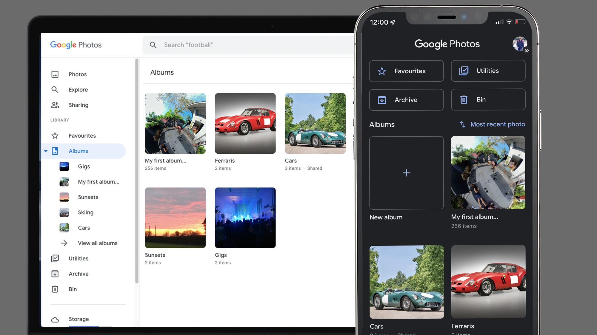 По этому скриншоту хорошо видно логику: слева в веб-версии — пункт Albums, внутри — список ваших альбомов, а на телефоне отдельным блоком вынесены Favourites, Archive, Bin, Utilities и сетка альбомов.