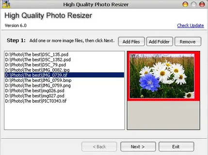 High Quality Photo Resizer — это компактная утилита для Windows, заточенная под одну практичную задачу: быстро и предсказуемо обработать пачку изображений одинаковым набором действий. В типовом сценарии вы добавляете файлы или целую папку, выбираете папку вывода, задаёте новый размер (в пикселях или процентах), формат сохранения и качество JPEG, при желании включаете поворот и простые эффекты, после чего запускаете пакетную обработку. Программа работает как пошаговый мастер (wizard): внизу всегда доступны кнопки перехода Back, Next и Exit, а вся логика разложена на несколько понятных шагов.