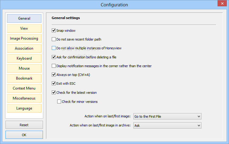 Вкладка Association нужна, чтобы Honeyview открывался по двойному клику для нужных форматов. Здесь обычно перечислены расширения (JPG/PNG/GIF/TIFF/WebP и т.д.), которые вы можете назначить Honeyview.