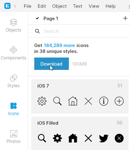Если библиотека неполная, в разделе иконок вы используете кнопку Download, чтобы докачать полный набор, и повторяете шаги.