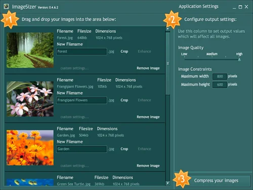 ImageSizer ориентирован на пакетную обработку изображений (batch image resizer): вы добавляете много файлов сразу, а программа применяет к ним одинаковые правила. В первую очередь это: