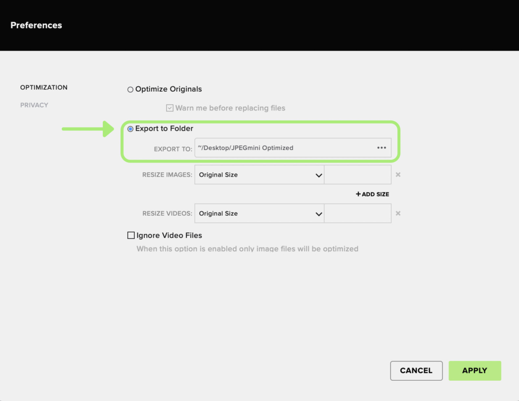 Export to Folder — сохранять оптимизированные копии в выбранную папку (самый безопасный вариант для начала).