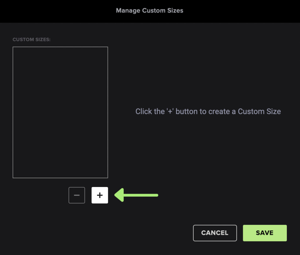 В окне Manage Custom Sizes нажмите кнопку + (плюс).