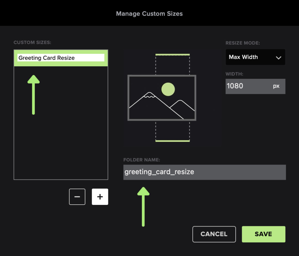 Resize с готовыми пресетами и пользовательскими профилями через Manage Custom Sizes….