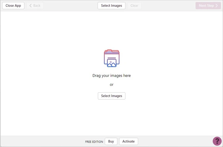 MakeWatermark начинает с максимально простого экрана импорта: в центре поле “Drag your images here” и дублирующая кнопка Select Images. Подход рассчитан на реальную рутину — когда у вас уже есть папка с фото, и вы хотите просто перетащить её в окно приложения.