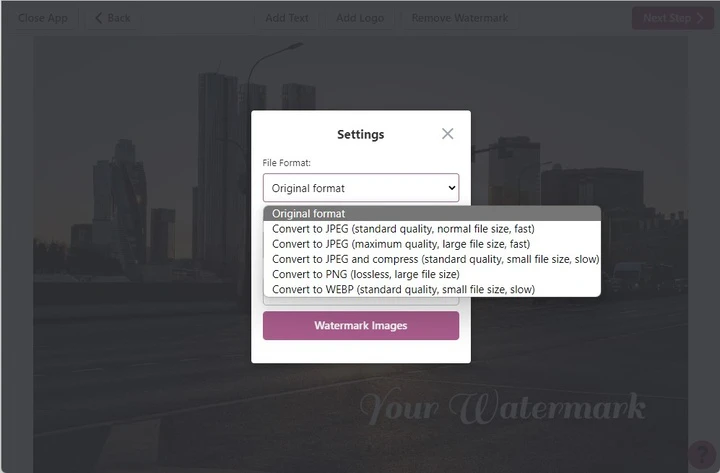 Next Step — перейти к этапу добавления watermark.