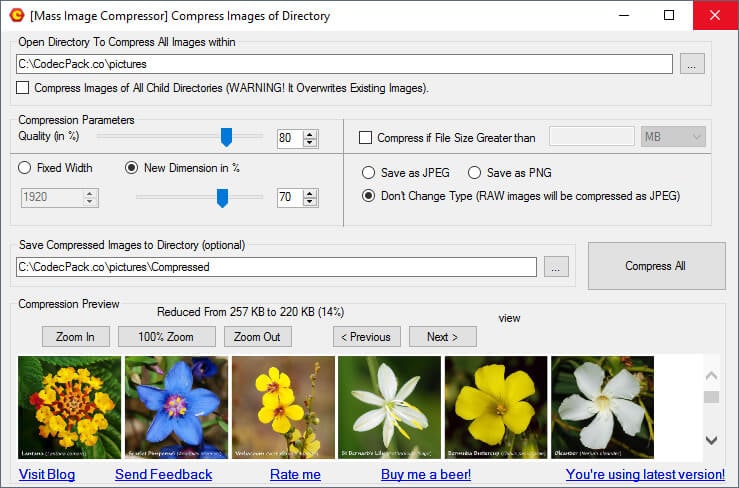Выбор, куда складывать результат. Часто используется режим вида “‘Compressed’ Folder In Selected Folder” — то есть отдельная папка Compressed внутри исходного каталога. -